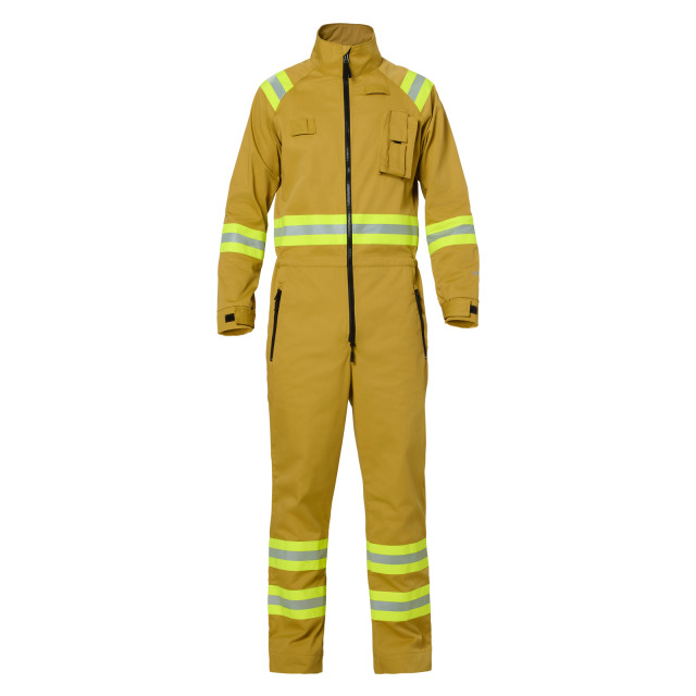 65% Polyester/35% Baumwolle, Farbe sand, Reflexbestreifung gelb/silber/gelb in Anlehnung an DIN EN 469 Anhang B