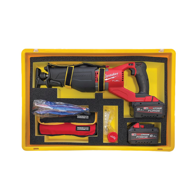Akku-Säbelsägeset WEBER RESCUE-SET FSX, mit MILWAUKEE Säbelsäge M18 FSX. MILWAUKEE 18 V/8 Ah FORGE-Akku, Redlink-Überlastungsschutz für hohe Lebensdauer von Akku und Motor, Sägeblattschnellwechselsystem FIXTEC zum werkzeuglosen Sägeblattwechsel. Schnitttiefe 300 mm in Holz, 150 mm in Metallrohre, 20 mm in Stahl, Hublänge 32 mm, Leerlaufhubzahl 0-3000 min-1. Metallhaken zum Aufhängen des Geräts, LED-Beleuchtung des Arbeitsbereichs, Schallleistungspegel 101 dB(A), ca. 9,8 kg (mit Akku)