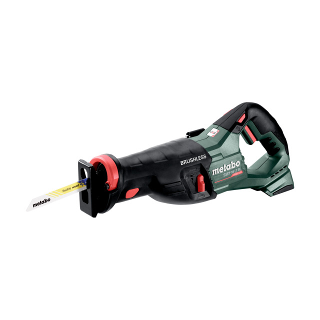 Akku-Säbelsäge METABO SSEP 18 LT BL. Softgrip-Handgriff für komfortables Sägen in jeder Arbeitsposition, Metabo Quick für werkzeuglosen Sägeblattwechsel, Sägeblatt um 180° drehbar, Werkzeuglos verstellbarer Tiefenanschlag für optimale Ausnutzung des Sägeblattes und vielseitige Anwendungen wie z.B. Tauchschnitte.
