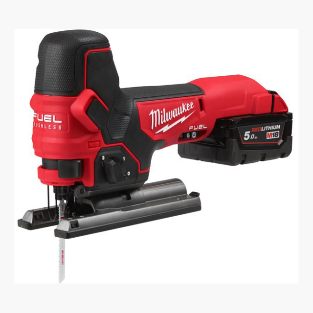 Akku-Stichsäge MILWAUKEE M18 JSB-502X. MILWAUKEE 18 V High Output Akkutechnologie M18 FUEL, Redlink-Überlastungsschutz für hohe Lebensdauer von Akku und Motor, Schnellwechselsystem FIXTEC zum werkzeuglosen Sägeblattwechsel. Schnitttiefe 100 mm in Holz, 10 mm in Stahl, 19 mm in Aluminium, Hublänge 25 mm, Leerlaufhubzahl 800-3500 min-1, 5-fache Pendelhubeinstellung, 6 Geschwindigkeitseinstellungen mit Sanftanlauf. LED-Beleuchtung des Arbeitsbereichs, Schallleistungspegel 100 dB(A), ca. 2,8 kg (mit Akku)