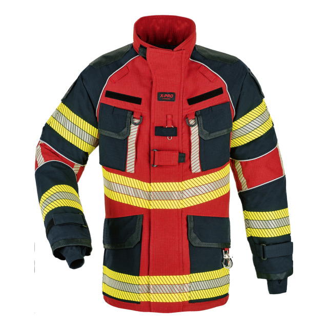 Überjacke WATEX X-Pro Dynamic, DIN EN 469:2020-12. Schutzklassen nach EN 469: Wärmeübergang Klasse 2, wasserdicht Klasse 2, atmungsaktiv Klasse 2. Raglanschnitt mit ergonomischer und körpernaher Schnittführung, Schnelltrennreißverschluss (Panikreißverschluss), 2 eingesetzte Seitentaschen mit Lasche für Karabinerhaken, Patte und Klettverschluss, abnehmbarer Karabinerhaken links, 2 aufgesetzte Funkgerätetaschen mit Patte und Klettverschluss, Halterung für Knickkopfleuchte in rechter Brusttasche, 1 Napoleontasche, Oberarmtasche links mit Patte und Klettverschluss. Ellbogenverstärkung aus Para-Aramid mit Silikonbeschichtung, Schulterpolsterung aus Neopren in Rippenstruktur, Halteschlaufen für Mikrofon im linken und rechten Schulterbereich, Ärmel mit Strickbündchen mit Daumenloch und Lasche mit Klettverschluss zur Weitenregulierung, Abriebschutz am Ärmelsaum, Nässesaugsperre im Jacken- und Ärmelsaum, Revisionsöffnung mit Reißverschluss, Tunnel für IRS