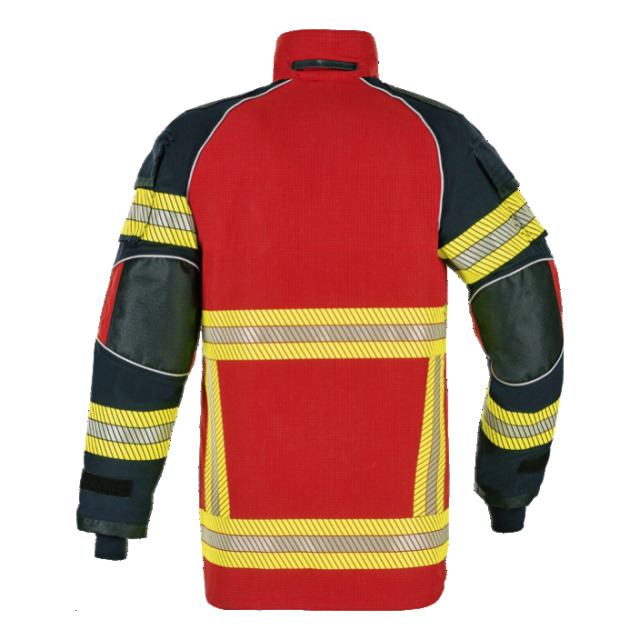Farbe Rumpf rot, Ärmel dunkelblau/rot, segmentierte Reflexbestreifung gelb/silber/gelb, abnehmbares Rückenschild silber reflektierend mit Aufschrift FEUERWEHR