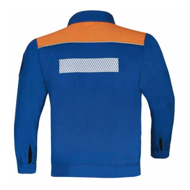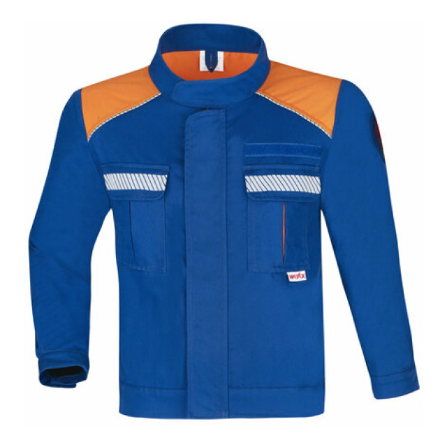 Blouson Jugendfeuerwehr WATEX, 65%Polyester/35% Baumwolle. Abgerundeter Stehkragen, Reißverschlussblende mit Klettverschluss vorn. 2 aufgesetzte Brusttaschen mit Patten und Klettverschluss, Klettband für Namenstreifen über der linken Brusttasche. Ärmelabzeichen DJF links, geschlitzte Ärmel, Bündchen verstellbar. Aufgesetzter Bund 50 mm mit seitlich verstepptem Gummiband, Verlängerungslasche und Klettverschluss. Farbe dunkelblau, Vor- und Rückenpasse warnorange, segmentierte Reflexstreifen silber 25 mm breit auf den Brustpatten sowie 300x50 mm waagerecht auf dem Rücken