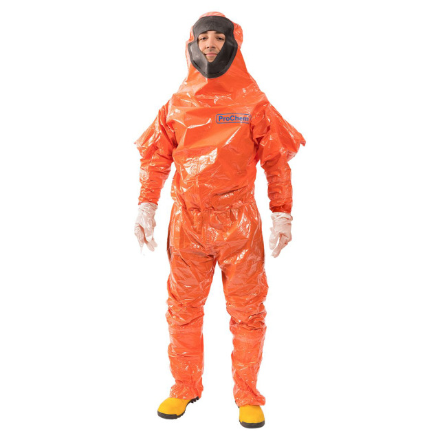 Chemikalien-Schutzkleidung 3S Pro-Chem II CLF gemäß Kategorie III der europäischen Richtlinien für persönliche Schutzausrüstungen. Trägermaterial CLF mit Barrierefilmlaminat und feuchtigkeitsabsorbierendem Innenvlies. Barriere gegen organische und hochkonzentrierte anorganische Chemikalien, Partikel, Staub. Schutzklasse Typ 3 (Schutz gegen Druckbeaufschlagung mit flüssigen Chemikalien), Typ 4 (Schutz gegen flüssige Aerosole), Typ 5 (Schutz gegen feste fliegende Partikel) und Typ 6 (begrenzter Schutz gegen Flüssigkeitsnebel), flüssigkeitsdicht bis 5 bar, geräuscharm. Biologischer Schutz nach EN 14126:2003, Schutz gegen Kontamination durch radioaktive Partikel (jedoch kein Schutz vor radioaktiven Strahlen) nach EN 1073-2, antistatisch nach EN 1149-1. Elastische Gummizüge, ergonomische Kapuze. Reiß- und abriebfest, fussel- und silikonfrei, antistatisch ausgerüstet.