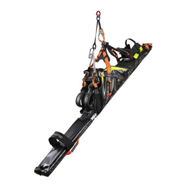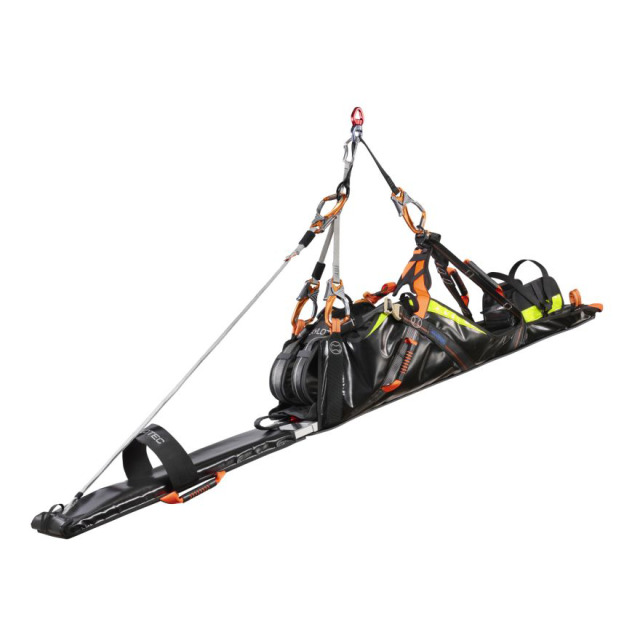 Rettungstrage ULTRAMEDIC CONREST PRO+, DIN EN 1497:2007-10, mit Beinstütze. Effiziente Lösung für den sicheren Transport verletzter Personen auch aus beengten Verhältnissen. Stabile und leichte Konstruktion mit Gleitplatte am Ober- und Unterteil zum mühelosen Ziehen über Böden oder Kanten, durch verschiedenste Anschlagmöglichkeiten lässt sich der Verletzte während der Rettung von der horizontalen in die vertikale Position bringen. Stabilisierung bei Wirbelsäulenverletzungen durch integriertes Spineboard mit gepolsterter Liegefläche, zuverlässige Kopffixierung. Reflektierenden Materialien für gute Sichtbarkeit in dunklen Räumen, farbcodierte Klickschnallen gewährleisten intuitive und einfache Handhabung. vielfältige Aufhängungsmöglichkeiten, z. B. mit Transportgehängen oder Halteseilen, die robusten Griffe und Schlaufen können als Anschlagpunkte verwendet werden. Belastbarkeit 150 kg, Farbe schwarz, (LxB) 2150x370 mm, ca. 13,5 kg