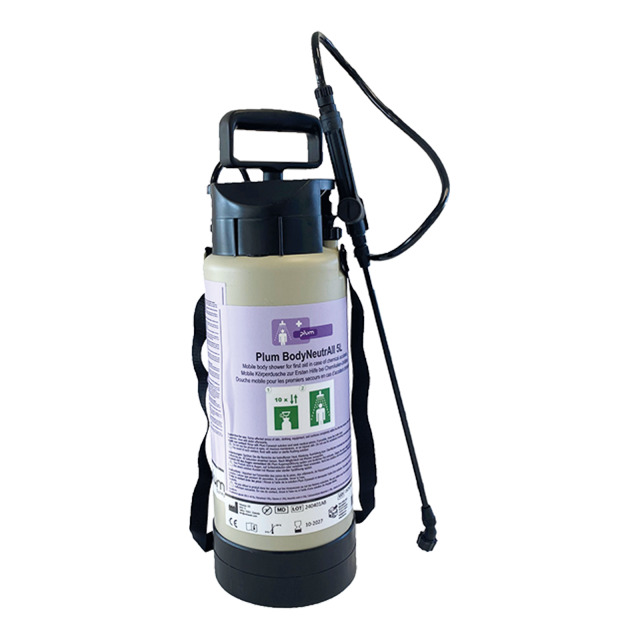 Dekon-Lösung PLUM Body NeutrAll zur schnellen und wirksamen Dekontamination von Körper und Oberflächen bei Kontakt mit ätzenden und giftigen Gefahrstoffen, starken Säuren und Laugen, Oxydationsmitteln, Formaldehyd, Phenol, organischen Lösemitteln, Flusssäure und Fluoriden