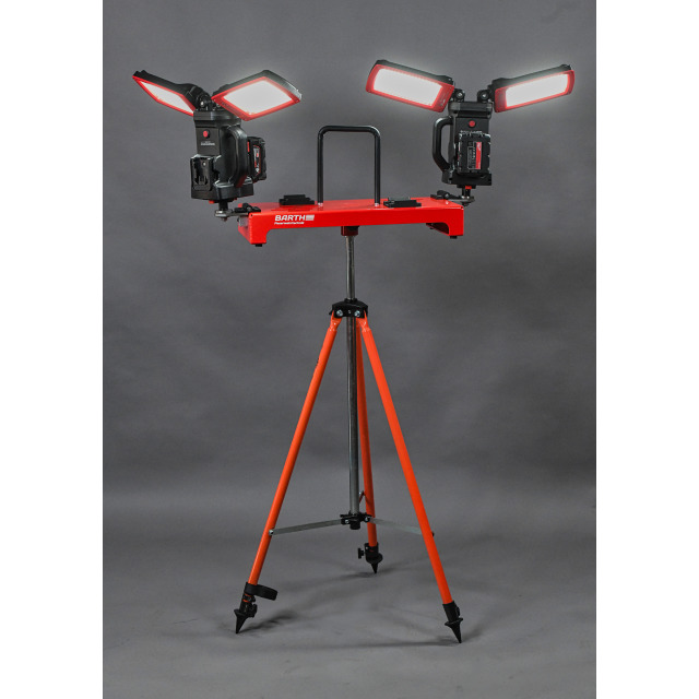Lichtbrücke BARTH DOUBLE TWIN-LIGHT D-TL 24.000 mit 2 LED-Doppelstrahlern, einzeln drehbar und nach unten kippbar, Gesamtlichtstärke 24.000 lm, einzeln in 4 Stufen wählbar, Leuchtdauer je nach eingestellter Lichtstärke und verwendetem Akku 1–8 h. Boden- oder Stativbetrieb, gleichzeitige Ausleuchtung des Umfelds und Fernausleuchtung möglich, beide Lichteinheiten können mittels Klickverschluss einfach von der Lichtbrücke entnommen und einzeln als Einsatzleuchten benutzt werden. Gestell aus Aluminiumblech, Tragebügel, Strahler zur kompakten Lagerung der Lichtbrücke einklappbar, IP54, Transportmaß (BxHxT) 630x280x280 mm, ca. 8,0 kg (ohne Akku)