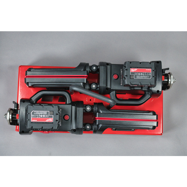 Lichtbrücke BARTH DOUBLE TWIN-LIGHT D-TL 24.000 mit 2 LED-Doppelstrahlern, einzeln drehbar und nach unten kippbar, Gesamtlichtstärke 24.000 lm, einzeln in 4 Stufen wählbar, Leuchtdauer je nach eingestellter Lichtstärke und verwendetem Akku 1–8 h. Boden- oder Stativbetrieb, gleichzeitige Ausleuchtung des Umfelds und Fernausleuchtung möglich, beide Lichteinheiten können mittels Klickverschluss einfach von der Lichtbrücke entnommen und einzeln als Einsatzleuchten benutzt werden. Gestell aus Aluminiumblech, Tragebügel, Strahler zur kompakten Lagerung der Lichtbrücke einklappbar, IP54, Transportmaß (BxHxT) 630x280x280 mm, ca. 8,0 kg (ohne Akku)
