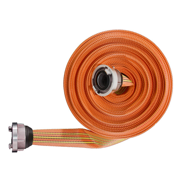 Druckschlauch G&H TITAN ATTACK, DIN 14811/A3:2018-12 Typ C 42-30-KL1-2-K-L3. Gewebe 100% Polyester, rundgewebt in spezieller Köperbindung mit 4-fach gezwirnter Kette, höchste Abriebbeständigkeit, Gummierung coextrudierte CR-Kautschuk-Kleberschicht, während der Vulkanisation fast vollständig in die Gewebestruktur eingedrungen. Verrottungsfest, pflegeleicht, farbbeständig, kälteunempfindlich, geeignet für Heißwasser. Hervorragende Beständigkeit gegen Seewasser, Chemikalien, UV-Strahlung und Ozon, sehr kleiner Biegeradius, minimierte Drallneigung und Dehnung, sehr glatte Innenseele mit geringem Reibungsverlust. Fluoreszierende Farbgebung, gut erkennbar auch bei schlechten Sichtverhältnissen wie Rauch und Dunkelheit