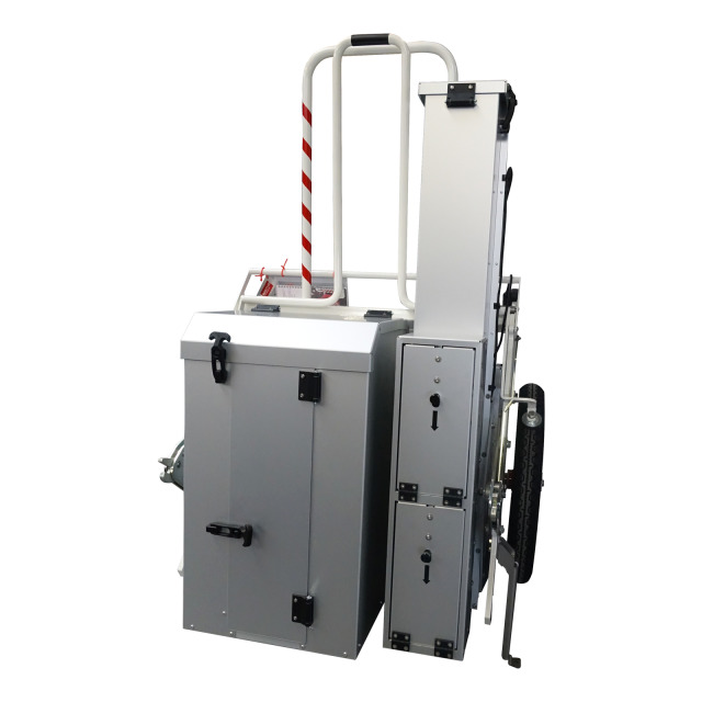 Heckseitig angebrachter Lagerungscontainer aus eloxiertem Aluminium mit Deckel zur Aufnahme von 4 Blitzleuchten Euro-Blitz. Der Container ist mittels 2 Armen am Griffbügel der Haspel befestigt und kann mit wenigen Handgriffen nach oben geklappt werden, so dass sich die Blitzkonsole 1,90 m über der Fahrbahn befindet. Die Konsole ist mit 3 gelben LED-Blitzern Ø 185 mm bestückt, schwenkbar und kann wahlweise nach vorn oder hinten gerichtet werden. Stromversorgung der Blitzeinheit durch MILWAUKEE 18 V, 8 Ah Akku (nicht im Lieferumfang enthalten) für autarken Betrieb der Blitzleuchten für 10 h