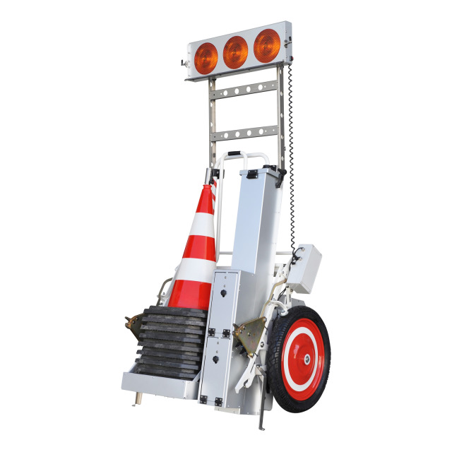 Ausführung links, Verkehrsleitkegel rechts, Faltsignale links (im aufgeprotzten Zustand in Fahrtrichtung gesehen)