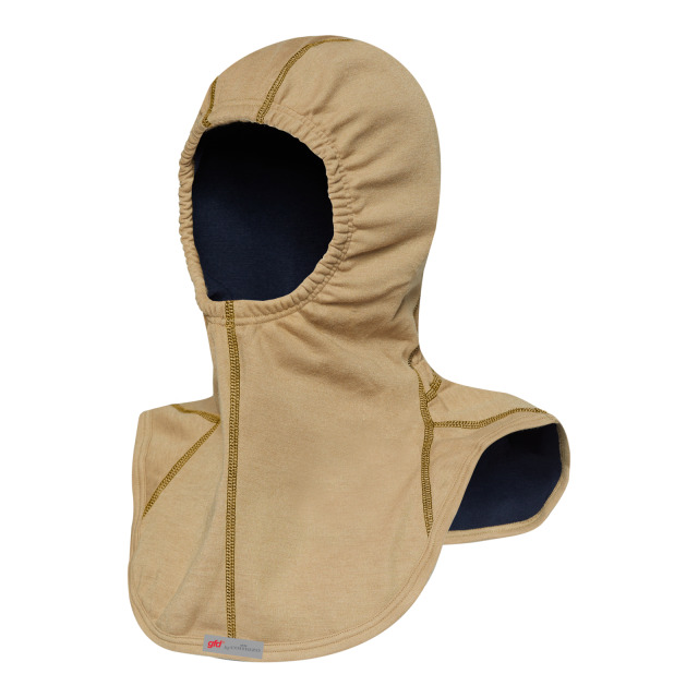 Feuerschutzhaube gfd by COMAZO ohne Schulternaht, DIN EN 13911:2017-11, DIN EN ISO 11612:2015-11, DIN EN 1149-5:2008-04. 3-lagig, zusätzliche Zwischenschicht mit sehr hoher Barriereeffektivität gegen das Eindringen von Partikeln, extra langer Hals-, Nacken- und Schulterbereich mit tragefreundlichen Flachnähten und Anti-Pilling-Effekt, Sichtöffnung mit Gummizug. Fest laminierte PU-Membran als dritte Lage an gesamter Haube für lange Funktionsfähigkeit der Membran, atmungsaktiv mit guter Feuchtigkeitsaufnahme, hautfreundlich, antistatisch, schwer entflammbar, passgenau, mit hohem Tragekomfort. 48,5% Aramid, 48,5% Lenzing FR, 3% Belltron, PU-Membran. Farbe sand, RFID, Einheitsgröße