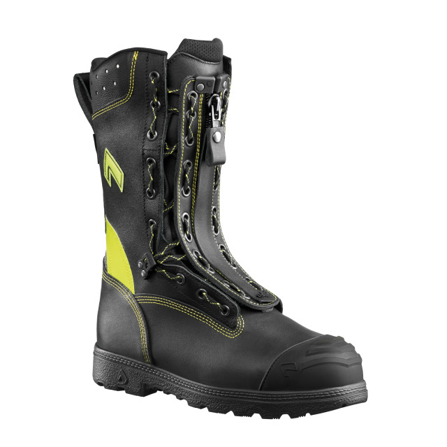 Feuerwehr-Schnürstiefel HAIX FIRE FLASH GAMMA 2.0, CE 0193 EN 15090:2012-04 HI3 CI CR SRC, Kategorie F2A, DIN EN ISO 17249:2014-05 Schnittschutz Klasse 2. Waterproof-Leder, Gore-Tex-Membrane, HAIX-Klimasystem, Sun Reflect, HAIX-MSL-System, HAIX 2-Zone-Lacing System, HAIX Certified Orthopedic System. Knöchelpolster, patentiertes Schnürsystem mit Schnelleinstieg, rückseitige Anziehschlaufe, Reißverschlussabdeckung EasyZip, Schnürbänder aus Nomex, Schnürbandfixierung, Beuge im Fersen- und Ristbereich, anatomisch geformte Einlegesohle mit sehr guter Feuchtigkeitsaufnahme und schneller Rücktrocknung, auswechsel- und waschbar. Gummiüberkappe, Zehenschutzkappe, durchtrittsichere Sohleneinlage, öl- und benzinbeständige Gummischalensohle mit selbstreinigendem Profil und Leitersteg. Schafthöhe 28 cm, Farbe schwarz, gelber Reflexstreifen, gelbe Nähte