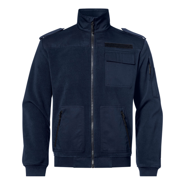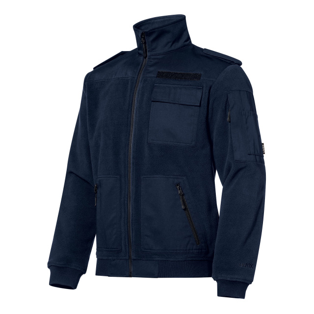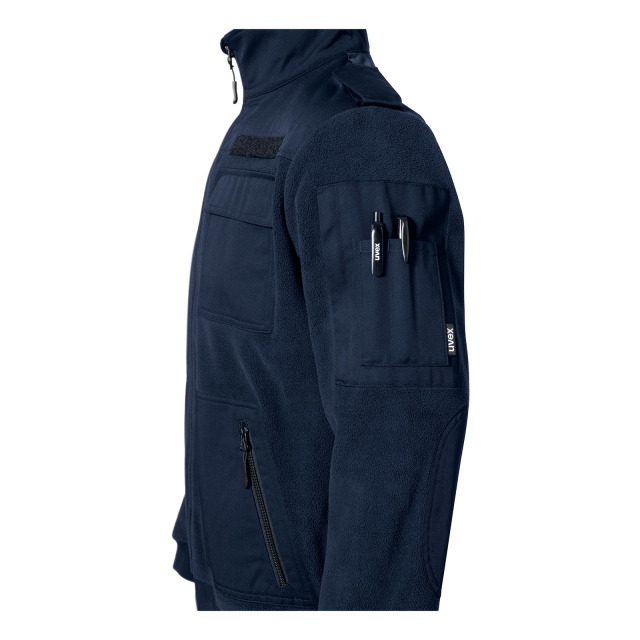Fleecejacke UVEX TD classic, individualisierbar.Stehkragen mit Innenkragen aus Fleece, durchgehender Reißverschluss, 2 aufgesetzte Seitentaschen mit Reißverschluss, Brusttasche links mit Patte, aufgesetzte Oberarmtasche links mit Reißverschluss und Stiftfächern, Taschen, Passe, Ellbogenschoner und Kragen aus robuster Webware, Flauschband für Namenstreifen auf linker Brust, Schulterklappen, waschbar bei 40 °C, bügelbar. Obermaterial 100% Polyester-Fleece, Besatz 65% Polyester/35% Baumwolle, Farbe dunkelblau