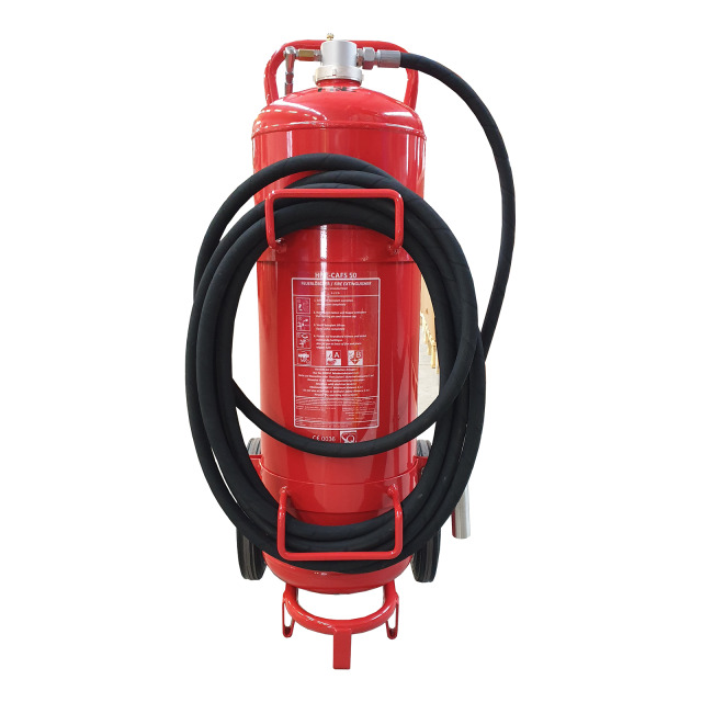 Hochleistungslöschgerät HNE CAFS 50, DIN EN 1866. Für Erstangriff bei Wohnungs-, Klein- und Entstehungsbränden, Fahrzeugbränden und Nachlöscharbeiten der Brandklassen A und B. Betriebsdruck 22 bar, Löschmittelstrahl mit Löschpistole ohne Rückschlag dosierbar, konstanter Betriebsdruck während des gesamten Löschvorgangs. Minimale Wartung und Unterhaltskosten, Fahrgestell mit 2 großen Laufrollen und Standfuß, Behälter und Verbindungen aus korrosionsbeständigem Material. Zugelassen für elektrische Anlagen bis 1000 V, Mindestabstand 4 m