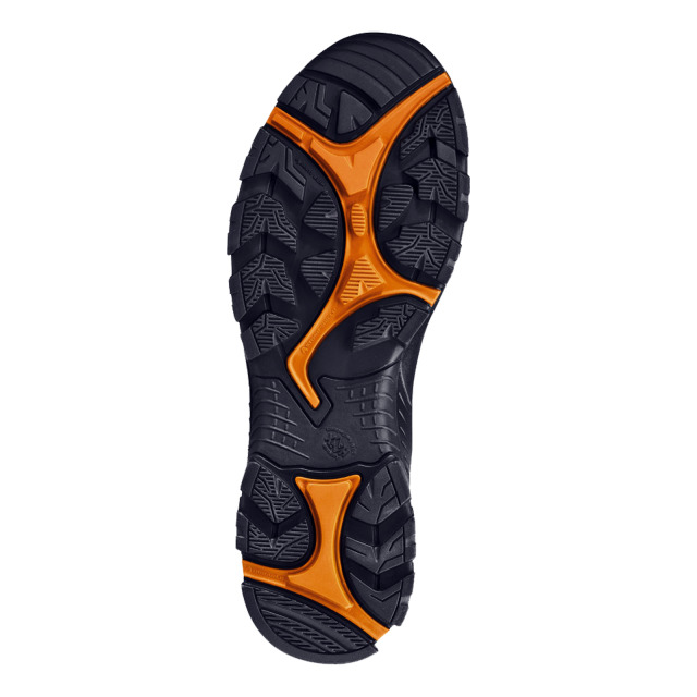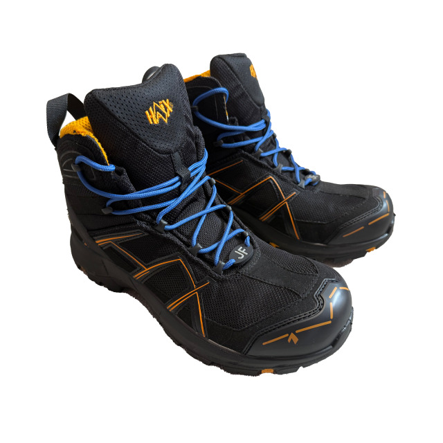 Obermaterial Mikrofaser/Textil, Farbe schwarz/orange/blau, Schriftzug JF silber auf der Lasche. Schafthöhe 13 cm, ca. 650 g