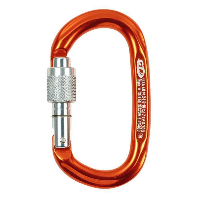 Karabiner SKYLOTEC OBX-SG, DIN EN 362:2008-09, DIN EN 12275:2013-06. Schraubsicherung, Catch-free Verschluss reduziert die Gefahr des Hängenbleibens. Bruchlast vertikal 24 kN, Öffnung 22 mm. Aus Aluminium, Farbe grau/orange, (LxB) 112x65 mm, ca. 80 g