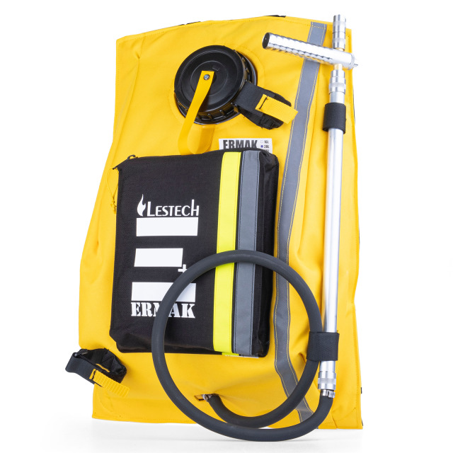 Löschrucksack ERMAK+ 20 für den Einsatz in unwegsamem Gelände bei Moor-, Wald- und Wiesenbränden sowie im Gebirge. Gepolsterte isolierende Rückeneinlage, gleichzeitig als Schutz vor kaltem Wasser dienend, einstellbare Schulter-, Taillen-, Hüft- und Beckengurte, Schultergurte mit Laschen zur Befestigung von Funkgerät und Mikrofon, Tragegriff. Löschlanze und weitere Ausrüstungsgegenstände lassen sich über zusätzlich angebrachte Laschen sicher am Rucksack befestigen, große Materialtasche auf dem Rucksack. Rucksack außen strapazierfähiges Gewebe, innen PES überzogen mit PVC, Befüllung auch im angelegten Zustand über große Füllöffnung.
