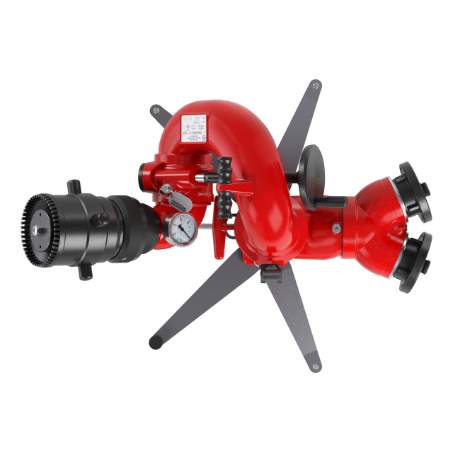 Durchflussmenge bis 5000 l/min, max. Eingangsdruck 16 bar, Gehäuse aus hart eloxierter Aluminiumlegierung, Lackierung rot RAL 3000, (LxBxH) Monitor 485x354x324 mm, Bodengestell 562x597x235mm, ca. 7,3/8,5 kg