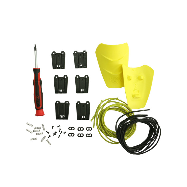 Reparaturset RapitFit für HAIX FIRE EAGLE 2.0. Bestehend aus Lace Lock 2.0 Federn/Schrauben/Deckel, Doppel-Ösen, Schraubendreher "RapidFit", 2 Paar Schuhbänder, Farbe schwarz/gelb.