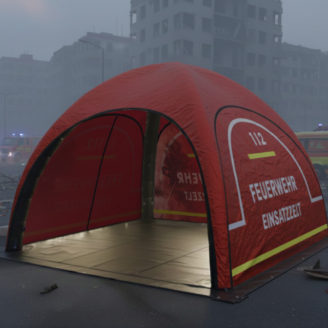 Schnelleinsatzzelt MAIN-ZELT 5x5 m, aufblasbar, mit PVC-Bodenplane, in Igluform, Grundfarbe rot mit Aufdruck ''112 FEUERWEHR'' in weiß auf 2 Seitenwänden. Komplettes Zeltset bestehend aus Standbeinen, Dach, Seitenwänden, Stützstruktur, Ventilsystem, Gewichten, Transporttasche und Zubehör. Dach und Seitenwände aus Polyestergewebe 420D, wasserfest, UV-beständig, Brandklasse B1 zertifiziert. Ventilsystem geeignet für Druckluft- oder Elektropumpenbefüllung