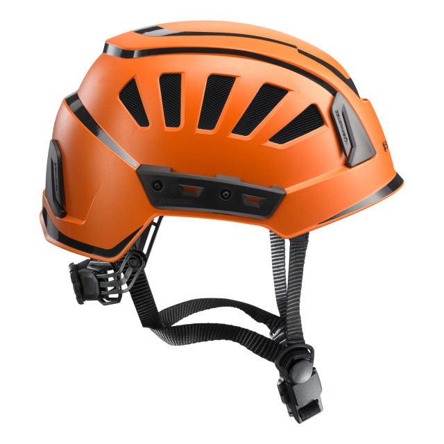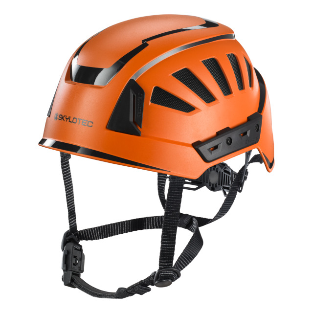 Schutzhelm SKYLOTEC INCEPTOR GRX REF, DIN EN 12492:2012-04. Für Höhenarbeit und Rettung, Helmschale aus PC/ABS mit Belüftungsöffnungen, EPS-Thorax, Kinnriemen mit Fidlockschnalle, Gear Rack zum Anbringen von Zubehör, Nackenband zur stufenlosen Anpassung an Kopfgrößen 54–63, Farbe orange reflektierend, ca. 460 g