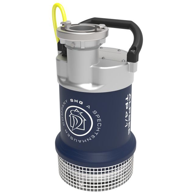 Tauchmotorpumpe SPECHTENHAUSER ALPSEE TP 4/1, DIN 14425:2017-04. Zur Förderung von Schmutzwasser mit Feststoffen bis 8 mm Ø Korngröße, effektive Flachabsaugung bis auf wenige Millimeter ohne weiteres Zubehör. Überlast- und Thermoschutz der Pumpe durch Temperaturüberwachung. Pumpengehäuse aus korrosions- und seewasserbeständiger Aluminiumlegierung, aus Edelstahl, Pumpenmantel aus Polyethylen, alle Schraubverbindungen aus Edelstahl, Laufrad aus verschleißfestem Gusseisen (EN-GJL-200), Tragegriff aus Polyamid. Abdichtung mit trocken- und dauerlaufgeeigneter Gleitringdichtung.