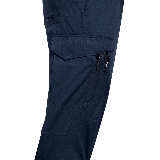 Tagesdienst-Cargohose performance FR UVEX, Damen. Schritteinsatz für gute Passform und ein hohes Maß an Bewegungsfreiheit. Bund mit verdecktem Haken- und Ösenverschluss, Gummizug seitlich. Innenliegendes Bundband verhindert Herausrutschen von Shirt oder Hemd, innenliegende Aufhängeschlaufe. Seitliche Eingrifftaschen, rechts mit innenliegender Chiptasche. Nachträgliches Anbringen eines RFID-Chips möglich (Chip nicht im Lieferumfang enthalten). 6 breite Gürtelschlaufen, Cargotasche links mit innenliegender Handytasche, Patte mit Klettverschluss. Cargotasche rechts mit außenliegenden Stiftfächern, Patte mit Klettverschluss.