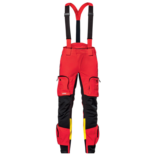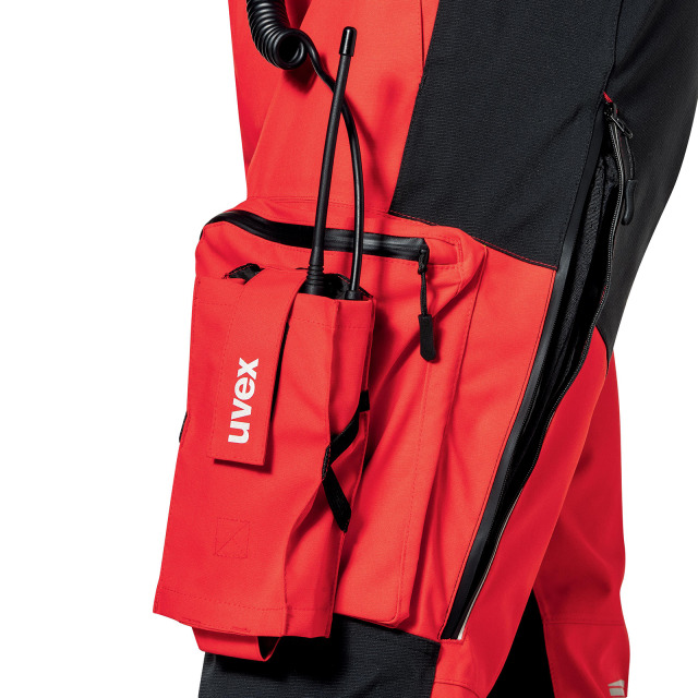 Höhenrettungshose UVEX, DIN EN 343:2010-05. Schnitt und Taschenpositionen zum Tragen mit unterschiedlichen Gurtsystemen angepasst, 2 seitliche Eingrifftaschen, 2 Oberschenkeltaschen, 2 Taschen am Wadenbein, alle Taschen mit wasserdichtem Reißverschluss und Lasche zur Sicherung des Inhalts, Ventilation mit wasserdichtem Reißverschluss im Oberschenkelbereich, innenliegende Taschen für Kniepolster, Beinabschluss mit Weitenverstellung, abnehmbare, längenverstellbare Hosenträger. Verbindung von Jacke und Hose durch Reißverschluss im Rücken möglich