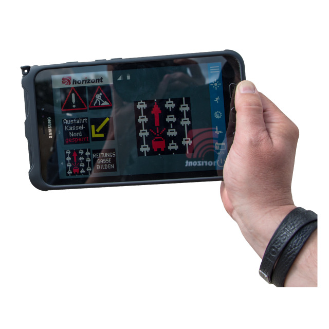 Verkehrsinformationssystem HORIZONT FeuVis+, klappbare LED-Wechselzeichenanlage zur Montage auf Fahrzeugdächern. Vollmatrix mit 1600 RGB-Hochleistungs-LEDs, mit 16,7 Millionen Farben und automatischer Helligkeitsanpassung mit zusätzlich 9 wählbaren Helligkeitsstufen, jeder Punkt frei programmierbar, wählbare Blinkrate 15-60 min, Bildwechselfrequenz 1000 Hz, Anzeige von Grafik und/oder Text, Kombination aus Standbildern und Wechselbildern möglich, frei belegbare Schnellwahltasten.