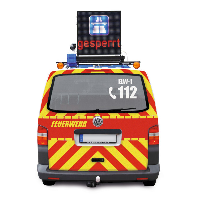 Dieses Wechselverkehrszeichen entspricht den Vorgaben des Merkblatts ''Verkehrsabsicherung von Einsatzstellen der Feuerwehren'' der SFS Würzburg sowie den Mindestanforderungen an Vorwarneinrichtungen des Bayerischen Innenministeriums 09/2019