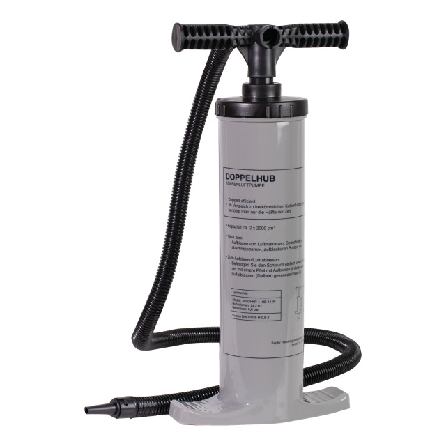 Standfeste Pumpe mit Fußbügel, Handgriff, Verbindungsschlauch und verschiedenen Adaptern