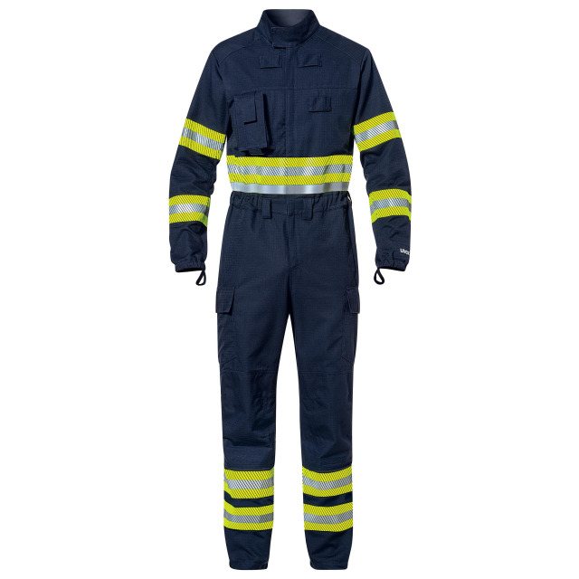 Waldbrand- und Multifunktionsoverall UVEX, DIN EN ISO 11612:2015-11, DIN EN 1149-5:2018-11, DIN EN 15384:2022-04. Zur Wald- und Vegetationsbrandbekämpfung, Außenbrandbekämpfung und Technischen Hilfeleistung (gem. DGUV-Information 205-014, PSA 05c), geeignet als CSA-Unterziehkleidung (gem. FwDV 500). Stehkragen mit Klettverschluss zur Weitenverstellung, High-Rise-Armkonstruktion für gute Beweglichkeit, 2-Wege-Reißverschluss, links aufgesetzte Funkgerätetasche mit Lasche und Klettverschluss, Antennenlasche und Mikrofonhalterung, 2 Seitentaschen, 2 Oberschenkeltaschen mit Patte und Klettverschluss, Tasche zu Aufnahme eines RFID-Chips. Armabschluss mit Gummizug, vorgeformte Knie mit Tasche zur Aufnahme eines Kniepolsters, weitenverstellbarer Beinabschluss, Schlaufen zum Anbringen von Ausrüstung, waschbar bis 60 °C, chemisch zu reinigen, bügelbar