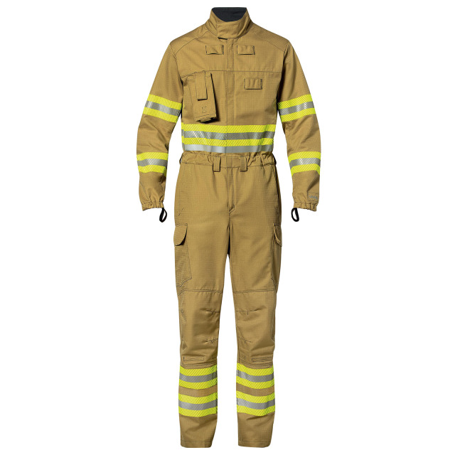 Waldbrand- und Multifunktionsoverall UVEX, DIN EN ISO 11612:2015-11, DIN EN 1149-5:2018-11, DIN EN 15384:2022-04. Zur Wald- und Vegetationsbrandbekämpfung, Außenbrandbekämpfung und Technischen Hilfeleistung (gem. DGUV-Information 205-014, PSA 05c), geeignet als CSA-Unterziehkleidung (gem. FwDV 500). Stehkragen mit Klettverschluss zur Weitenverstellung, High-Rise-Armkonstruktion für gute Beweglichkeit, 2-Wege-Reißverschluss, links aufgesetzte Funkgerätetasche mit Lasche und Klettverschluss, Antennenlasche und Mikrofonhalterung, 2 Seitentaschen, 2 Oberschenkeltaschen mit Patte und Klettverschluss, Tasche zu Aufnahme eines RFID-Chips. Armabschluss mit Gummizug, vorgeformte Knie mit Tasche zur Aufnahme eines Kniepolsters, weitenverstellbarer Beinabschluss, Schlaufen zum Anbringen von Ausrüstung, waschbar bis 60 °C, chemisch zu reinigen, bügelbar