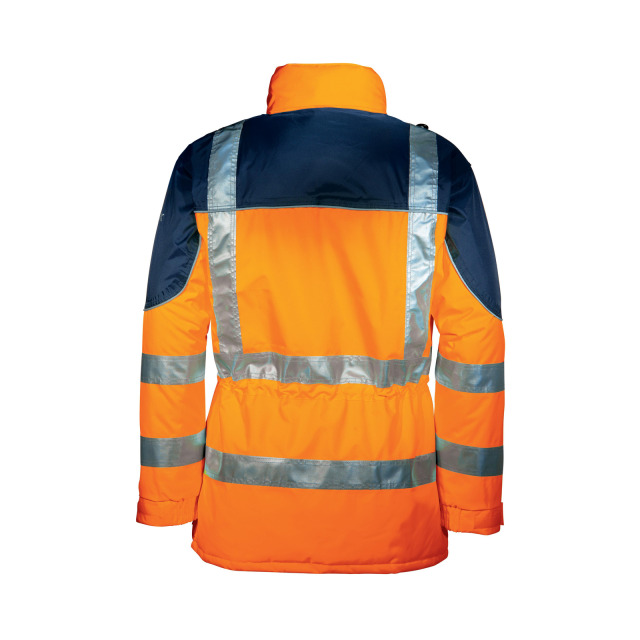 Warnschutzparka UVEX 8845, DIN EN 343:2010-05. Reflexstreifen am Rumpf und Ärmeln, Hochschließender Kragen mit verstaubarer Kapuze. 2 Seitentaschen, 2 Brusttaschen, Handytasche, Stiftfachtasche und Innentasche. Saum und Taille weitenregulierbar, wattiertes, fest eingearbeitetes Futter zur Thermoisolierung, verdeckter 2-Wege-Frontreißverschluss mit Kinnschutzblende, Service-Reißverschluss für die Emblemanbringung