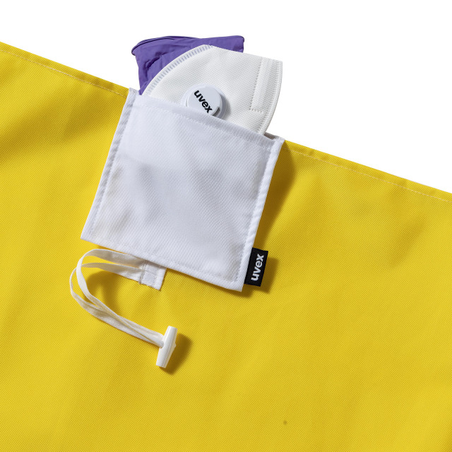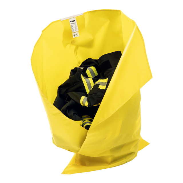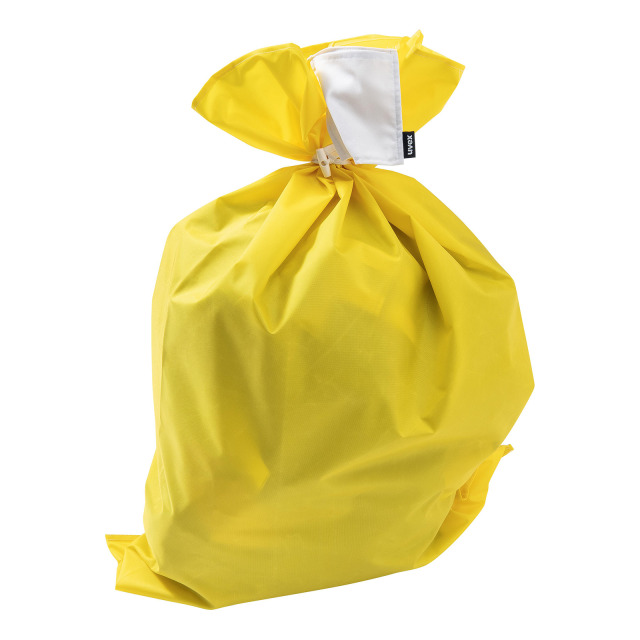 Wäschebeutel UVEX für PSA, zum sicheren Transport kontaminierter oder infektiöser Ware zur Vermeidung von Kontaminationsverschleppung. Wiederverwendbar, Reinigung erfolgt zusammen mit der PSA. Lose hängende Tasche zur Dekontamination von Einweghandschuhen und -masken vor dem Entsorgen, Platz für RFID-Chip oder sonstige Identifikation